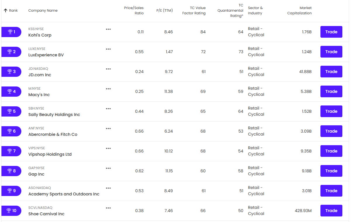 Currently ranked #2 in our screener, LuxExperience is also the second smallest company listed. Despite its size, it holds the highest TC Quantamental Rating at 73 and the lowest price-to-earnings (P/E) ratio at 1.47. Year to date, it has surged by 20.3%. With a projected price target of $12.40 over the next 12 months, LUXE offers a potential upside of 38%. Similar to Kohl’s, LuxExperience has strong Quality and Momentum scores of 70 and 80, respectively, while its price-to-book ratio is below 1.