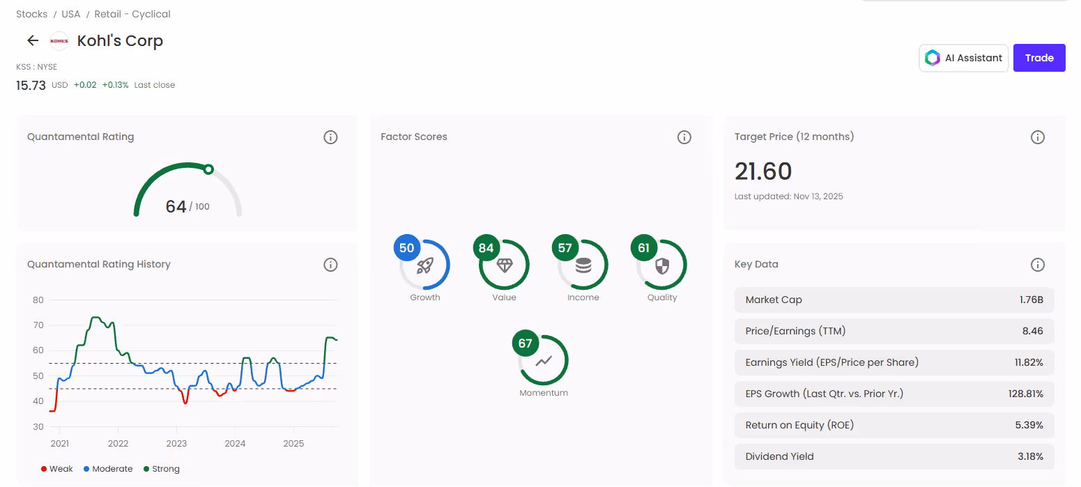 Kohl’s ranks at the top of our screener with a market capitalization of $1.76 billion. It has the second-highest TC Quantamental Rating (TCQR) of 64 (tied with Sally Beauty) and boasts the highest Value Factor Rating at 84. So far this year, the stock has appreciated by 12.1%, and with a projected price of $21.60 over the next 12 months, it presents a potential upside of 37%. In addition to its strong Value score, Kohl's also has a Momentum score of 67, a Quality score of 61, and an Income score of 57. Notably, it features a price-to-book ratio of 0.46 and a Fair Value estimate of $35.04, based on a two-stage residual income model.