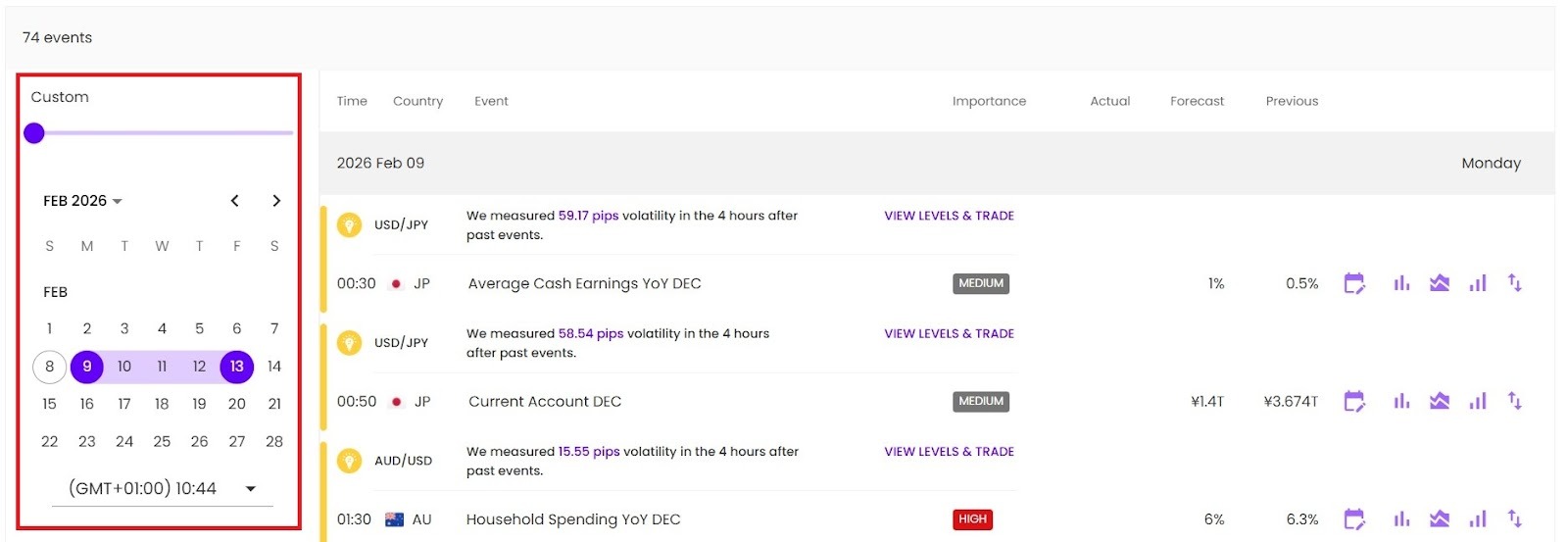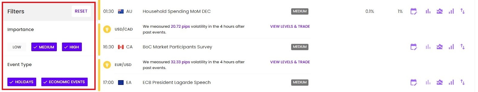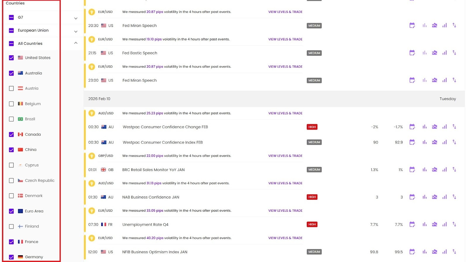 We can select economic data of "High", "Medium" or "Low" importance, or any combination of such filters:
