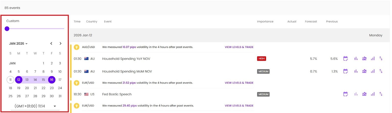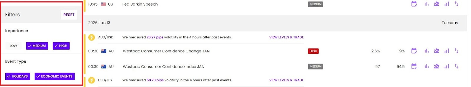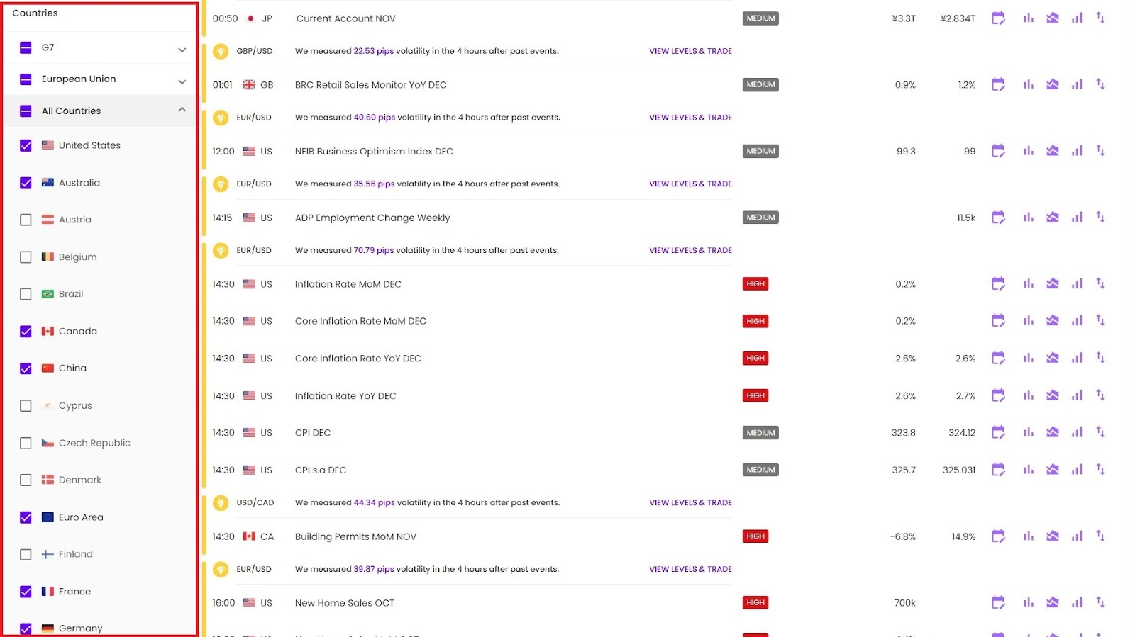 We can select economic data of "High", "Medium" or "Low" importance, or any combination of such filters: