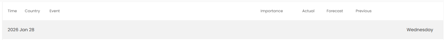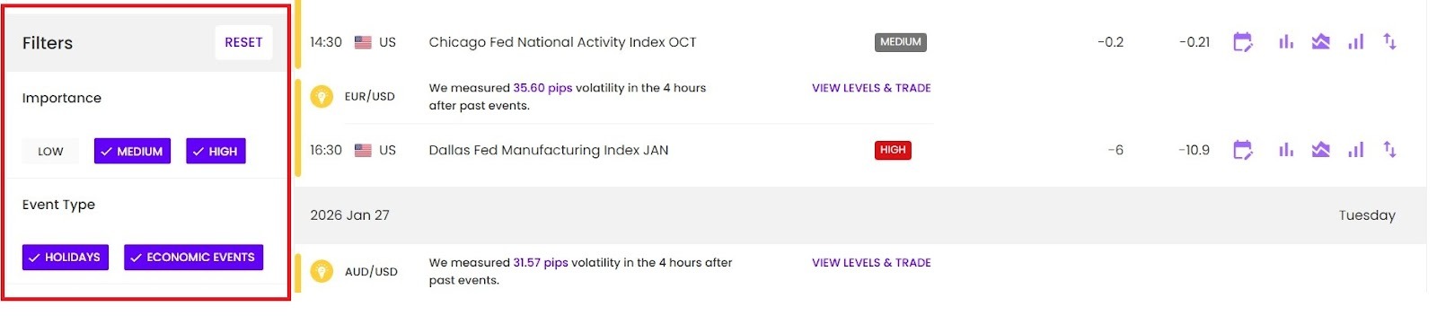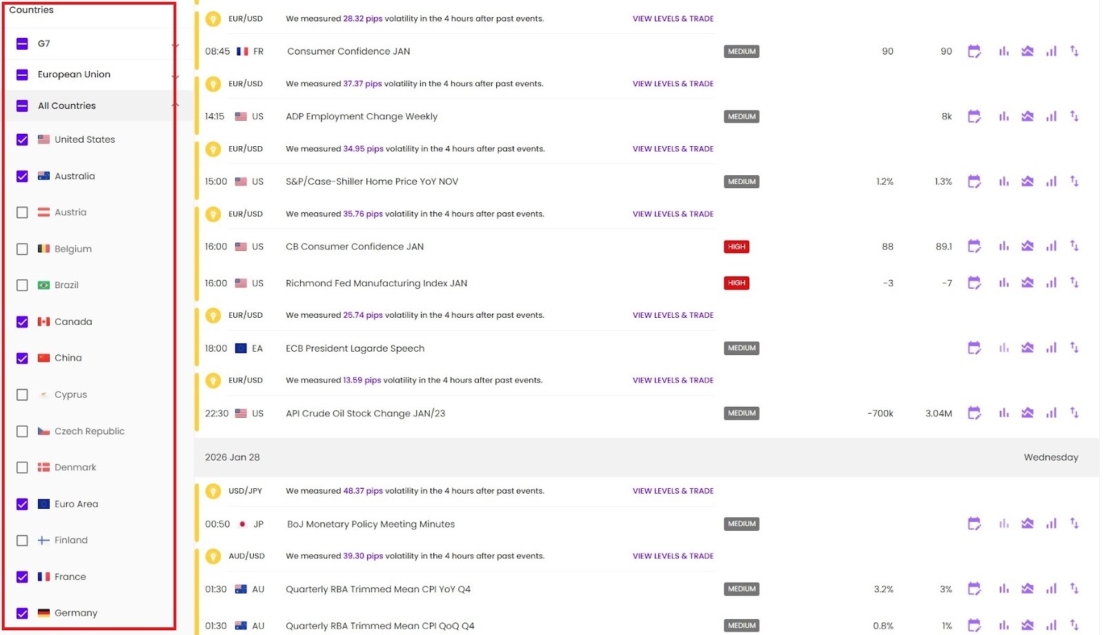 We can select economic data of "High", "Medium" or "Low" importance, or any combination of such filters: