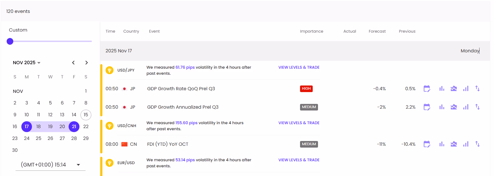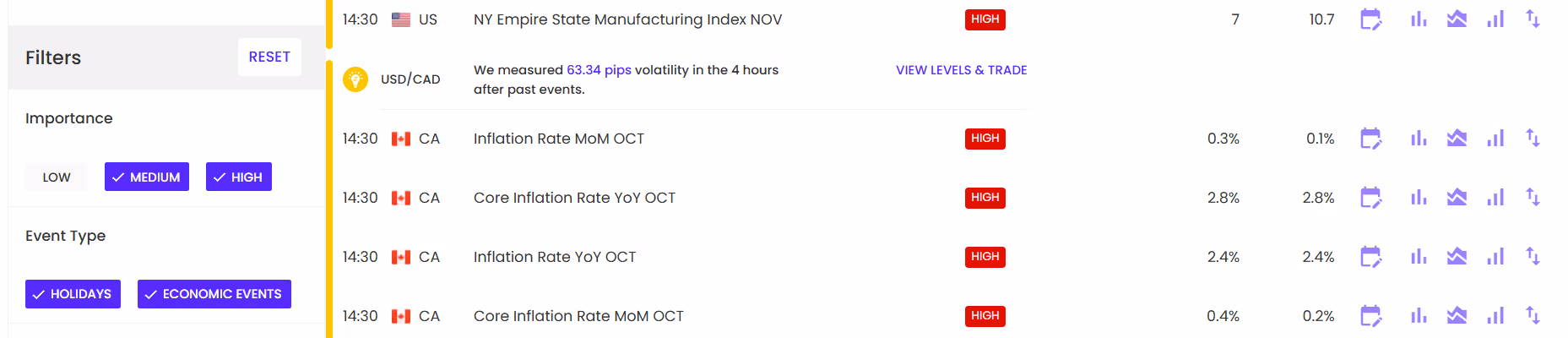 We can select economic data of "High", "Medium" or "Low" importance, or any combination of such filters: