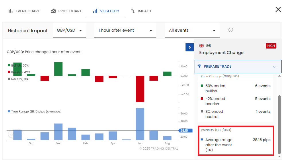 In the Impact session, we can see that last time GBP/USD moved in a range of 21 pips during the hour after the data release: