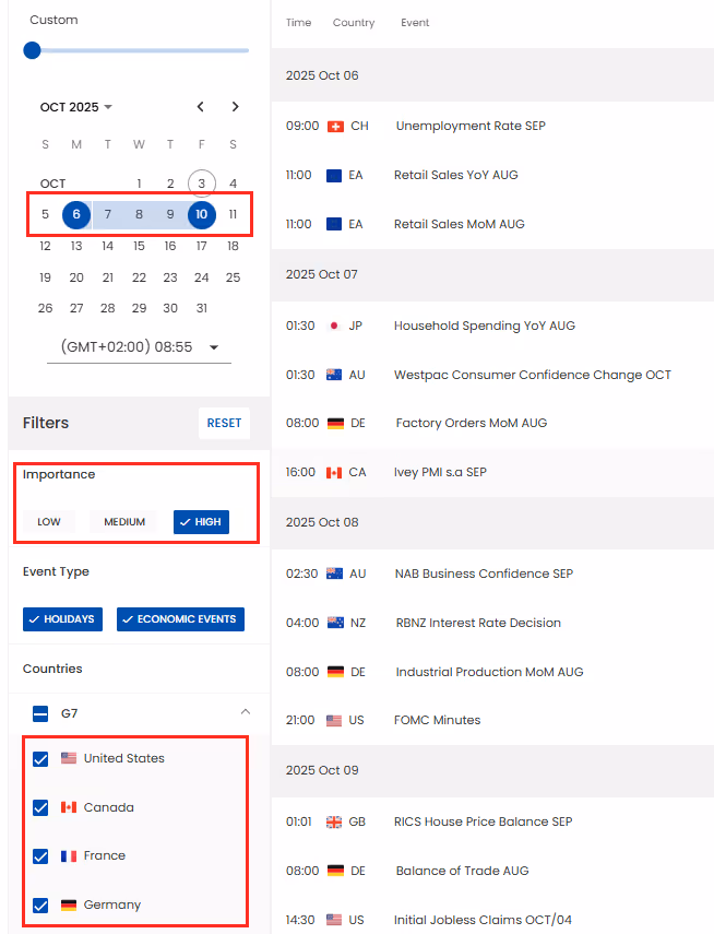 In Economic Insight, users can customize settings by selecting date, importance and countries on the left menu: