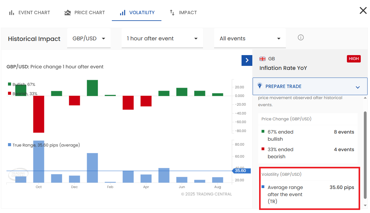 The Volatility session showed that the average pips range (1 hour) for the past 12 releases is about 35 pips for GBP/USD: