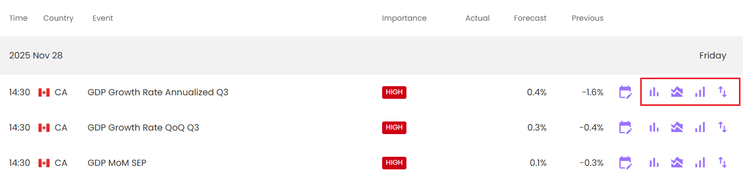 We are looking at Canada's GDP due on Friday (November 28) and we can click on those little icons on the right to find out more information related to the event: