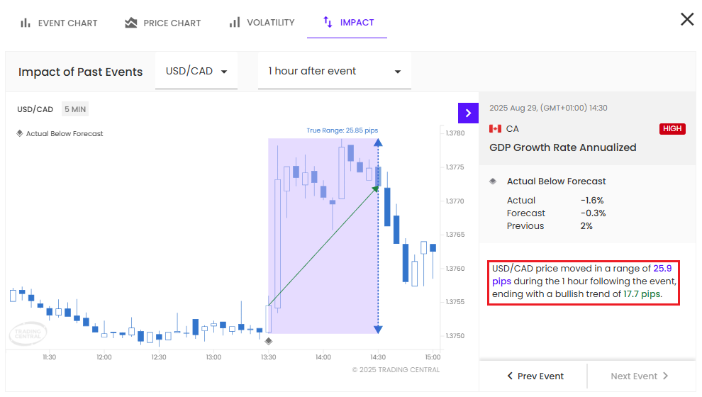 In the Impact session, we can see that last time USD/CAD moved in a range of 26 pips during the hour after the release: