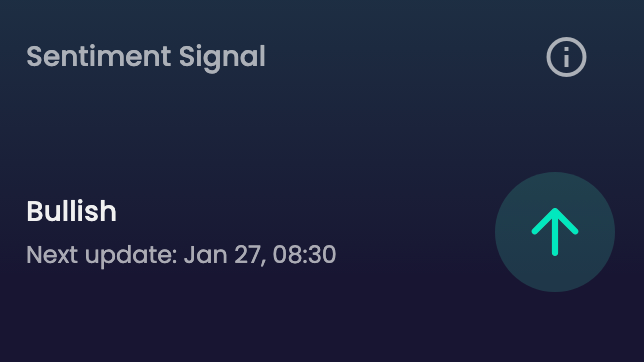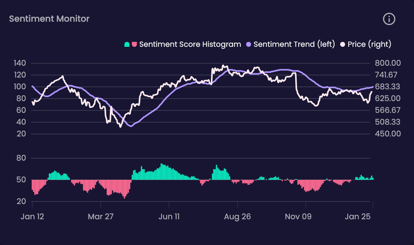 A rising sentiment trend is reflected by a Sentiment Score above 50, triggering a buy signal (bullish). Conversely, a declining sentiment trend is reflected by a Sentiment Score below 50, triggering a sell signal (bearish).